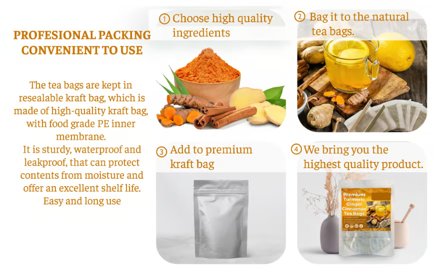 Introducing our Premium Turmeric Ginger Cinnamon Teaโhand-crafted with 100% natural ingredients to support daily wellness. This earthy, aromatic blend helps soothe the body and mind, with no sugar, no caffeine, and no gluten. Packed in eco-friendly tea bags and sealed for freshness, itโs the perfect ritual for morning clarity or evening calm.